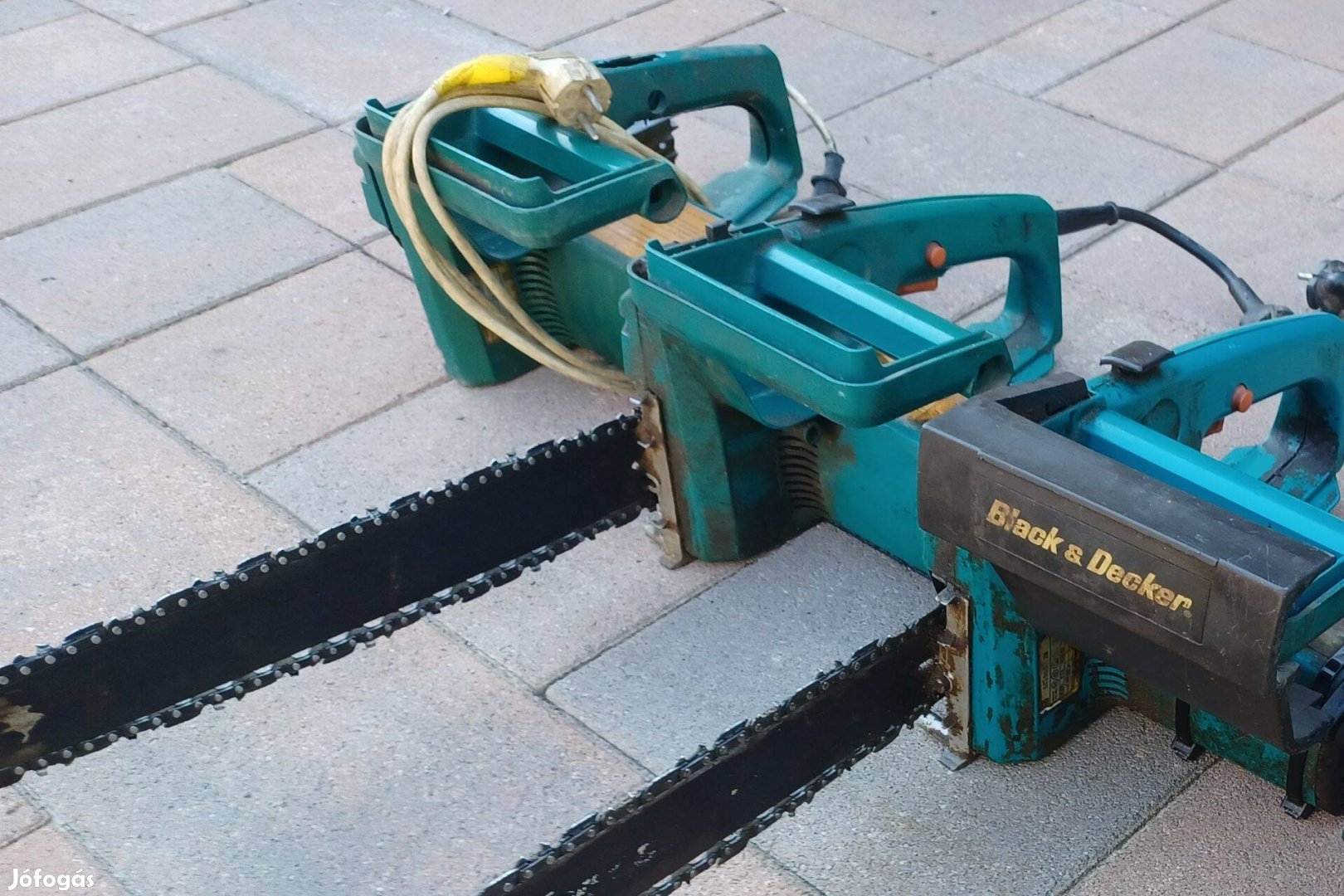 Eladó a képeken látható 2 db elektromos láncfűrész. Az ár tartalmaz egy harmadikat is tartalék alkatrésznek, abban benne van a két működőhöz passzoló villanymotor is. Komolyabb használat előtt némi karbantartást javaslok (pl. az egyiknek repedt a burkolata, a másiknak az indító gombja nem mindig reagál), de ettől függetlenül is működnek és azonnal használhatók. Ezek még a 80-as évek közepi gyártású minőségi Black & Decker láncfűrészek, Made in England, Made in France.