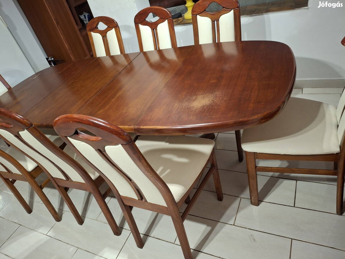 6 személyes személyes spanyol étkező asztal, ami 10 személyesre bővíthető szép állapotban 8 db bőr kárpitozású székkel eladó.