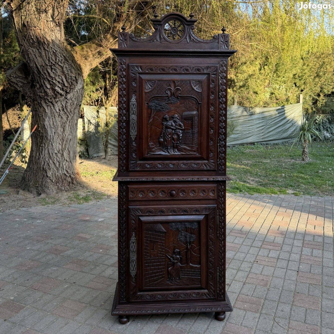 Egy gyönyörű, gazdagon faragott, klasszikus breton (Bretagne-i) kabinetszekrény, amely a 19. század végének népszerű stílusjegyeit hordozza. Az ilyen típusú bútorok a francia vidéki historizmus elemeit ötvözik, különös tekintettel a tengerparti életképekre és a helyi mitológiára. Anyaga sötétre pácolt, tömör tölgyfa, amely a breton bútorok hagyományos alapanyaga.