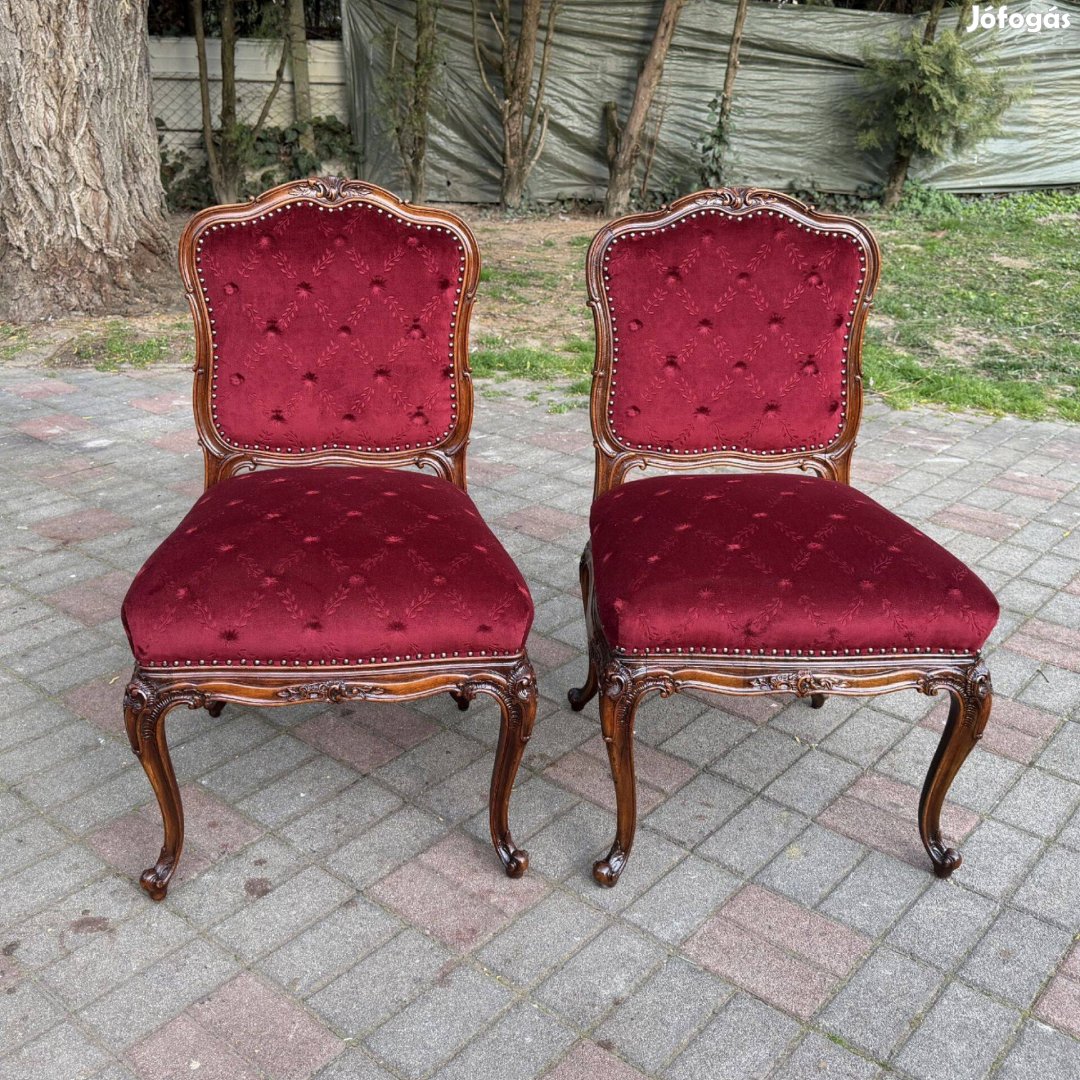 Egy elegáns, neobarokk stílusú szék páros. Faragott, ívelt fa vázzal készültek, ami finom, díszes részletekkel gazdagított. Az ülőfelület és a háttámla mély bordó színű, bársonyos hatású kárpittal van bevonva, amelyet gombtűzött (kapitonált) mintázat és szegecses szegély díszít. Az összhatás kifinomult és időtálló, akár antik vagy vintage enteriőrbe is jól illeszkedik.