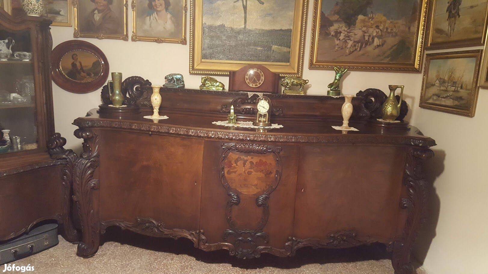 Antik ebédlőgarnitúra az 1880-as évekből!!! Kézzel faragott intarziás csoda!!! Nagytálaló, kistálaló, vitrin, szétnyitható ovális asztal 6 db támlás szék és 2 db karfás fotel.