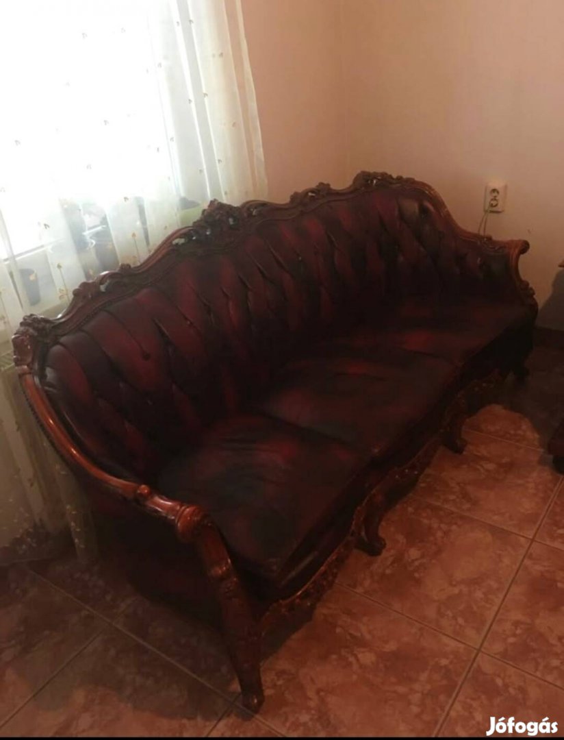 Eladó a képen látható barokk stílusú szalon bőr ülőgarnitúra. A faragása hibátlan. Kanapé + 2 db fotel. Szakadás nincs a bőrön.