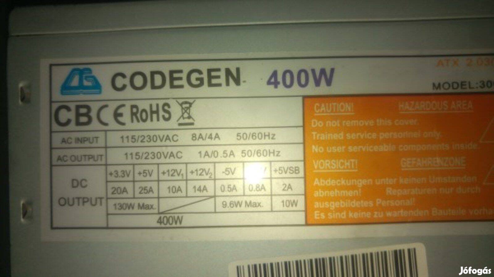 Codegen 400W-os tápegység számítógépbe tesztelt, működő a képeken látható állapotban eladó. Az ár 1db-ra vonatkozik.