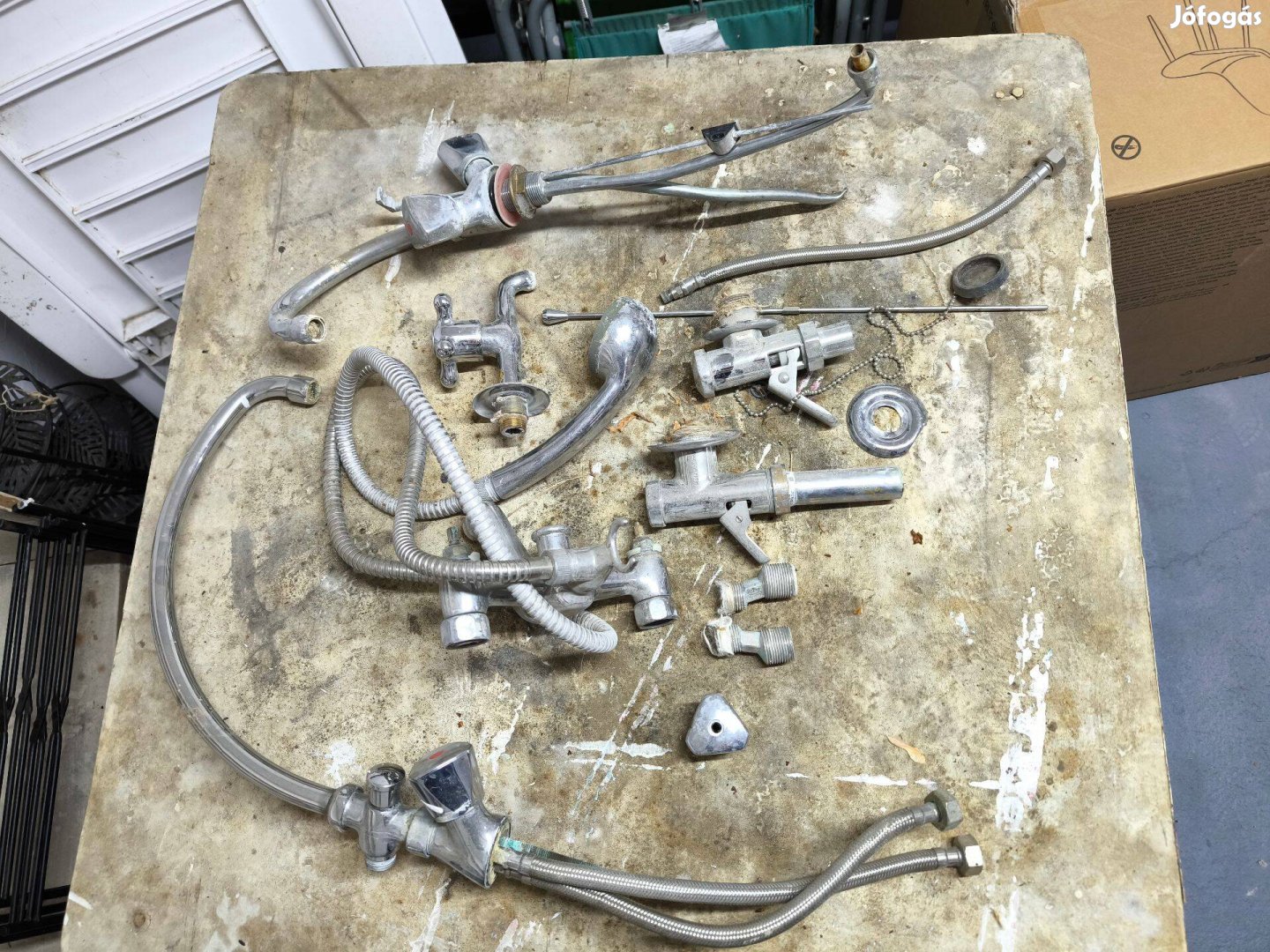 Eladó a képen látható használt csaptelep és szerelvény csomag. Vannak közte működőképes és felújítandó darabok is (tisztítást, vízkőtelenítést igényelnek).
