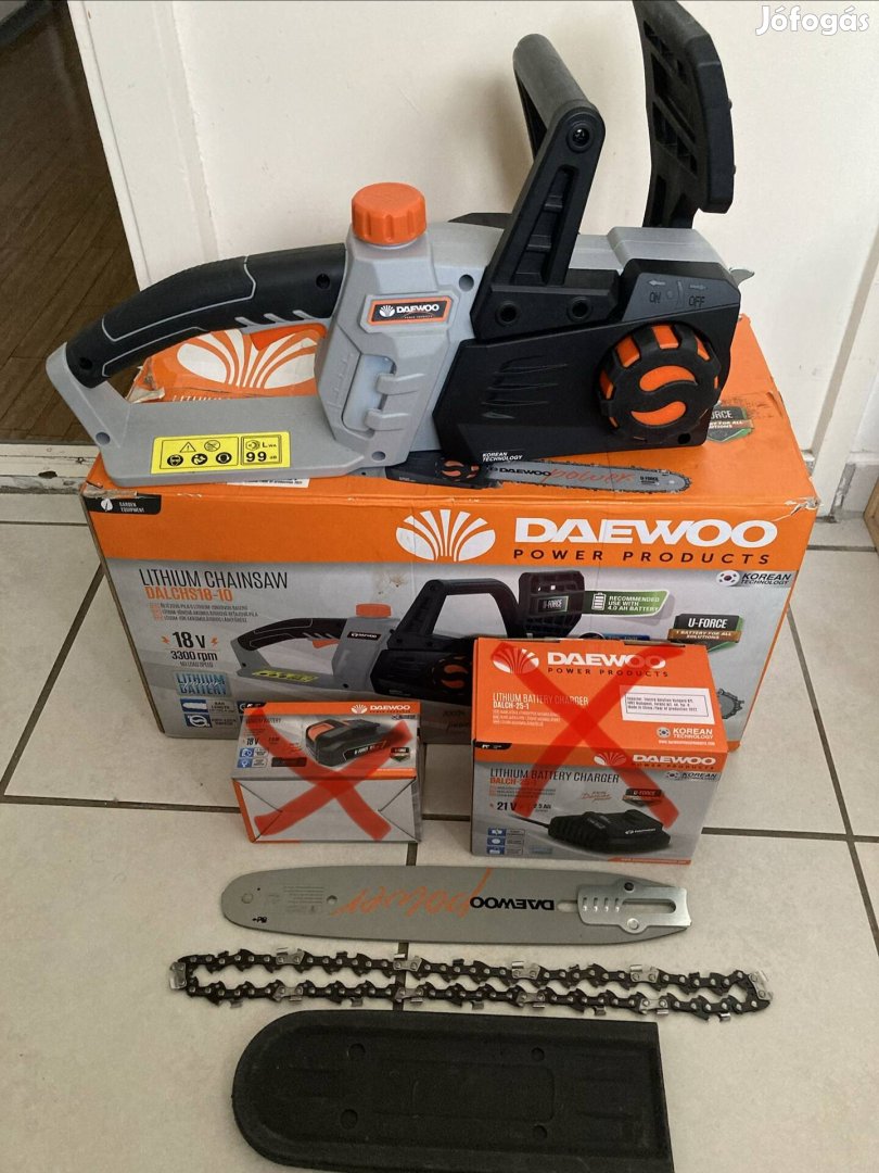 Daewoo Dalchs-10 akkumulátoros láncfűrész, új, dobozában,25 cm-es vágólappal, akku és töltő nélkül.