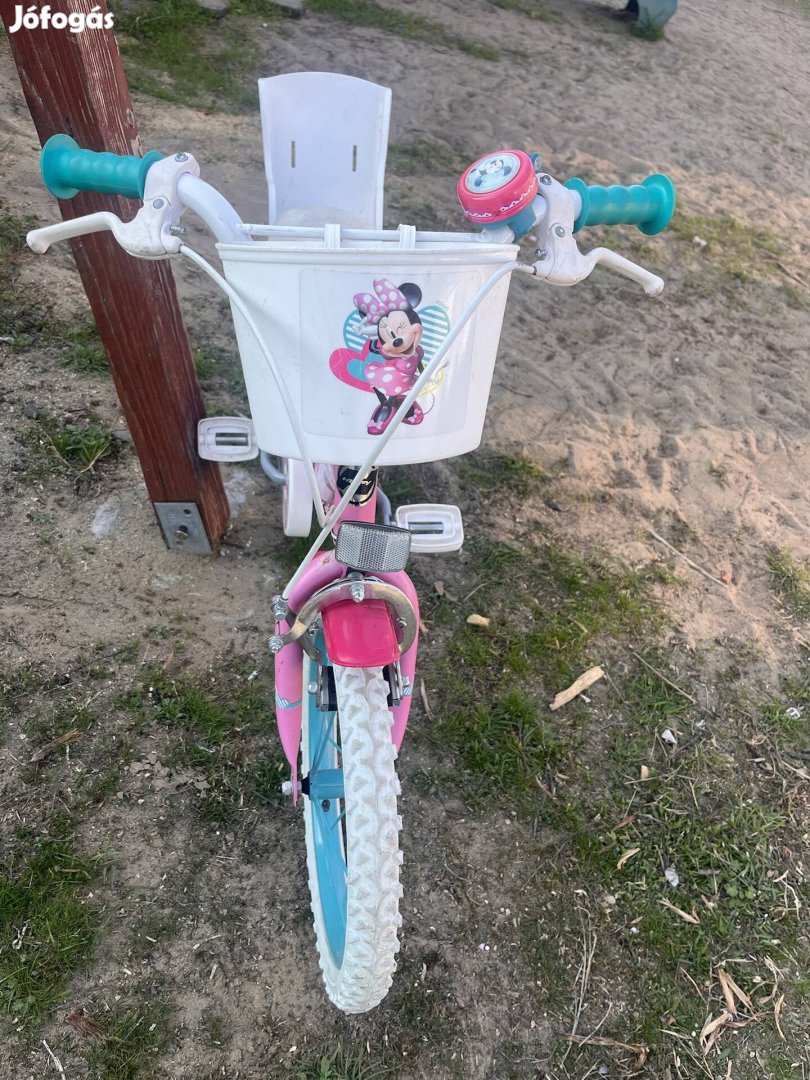 Disney Minnie Mouse tematikájú gyerek kerékpár látható, amely kifejezetten kisgyermekek számára készült, vidám rózsaszín és türkizkék színekben. A bicikli több praktikus kiegészítővel is fel van szerelve, amelyek megkönnyítik a tanulást és a játékot. Méretek: A modell jellemzően 12", 14" vagy 16"-os kerékmérettel érhető el, a gyermek magasságától függően (kb. 3-7 éves