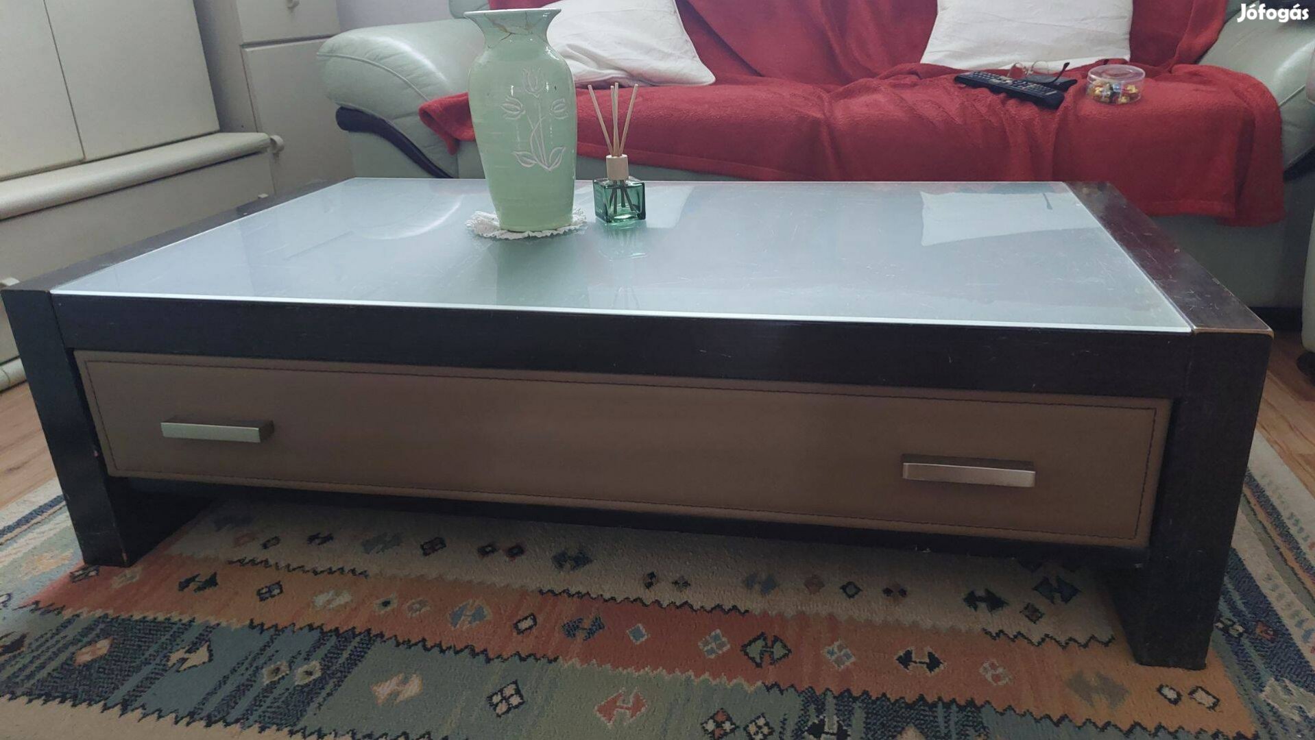 Nagyméretű (165x65cm ) masszív, nehéz, fa dohányzóasztal, 4mm vastag, halványzöld üveglappal. Üveglap alatt a fa lakkozása kopott, asztal élein is kopás nyomok láthatók. Hatalmas fióknak köszönhetően nagy pakolási lehetőséggel! Fiók mind két oldalról kihúzható, bőr borítású.