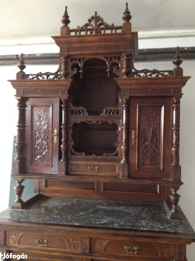 Dúsan faragott, jó állapotú ,két részből álló, márványlapos tálalószekrény . Méretei: M:2,30m, Sz:1,10m, mélység: 0,62m