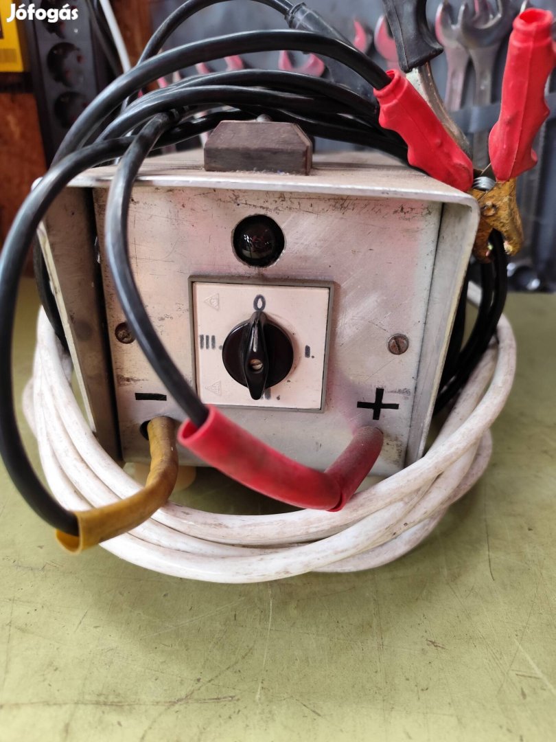 Eladó a fotókon látható akkumulátor töltő. Nem mai darab, de cserébe jó nehéz. Hosszú 230 volt vezetékkel és dugvillával, akksi csipeszekkel.