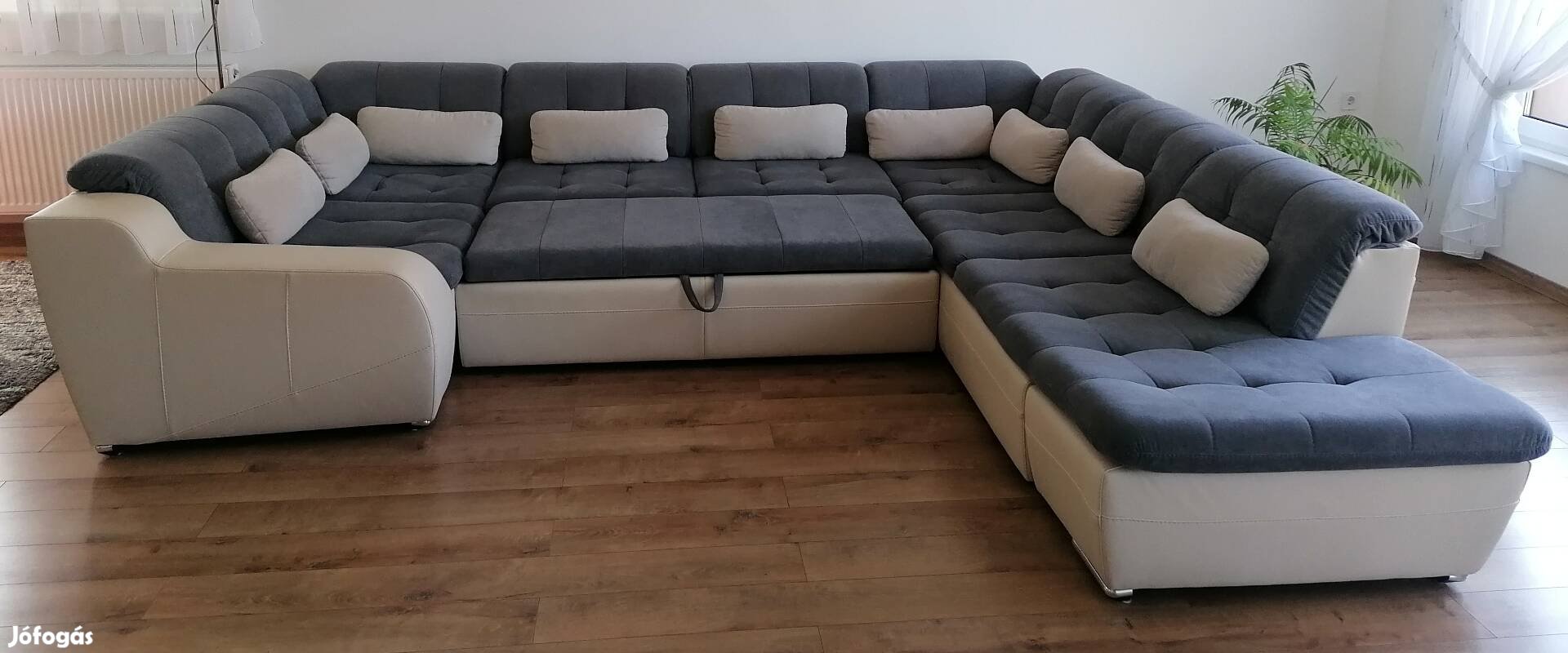 Eladó U alakú ülőgarnitúra 340*300*210 cm, kihúzható, ágyneműtartós, háttámlája felhajtható.