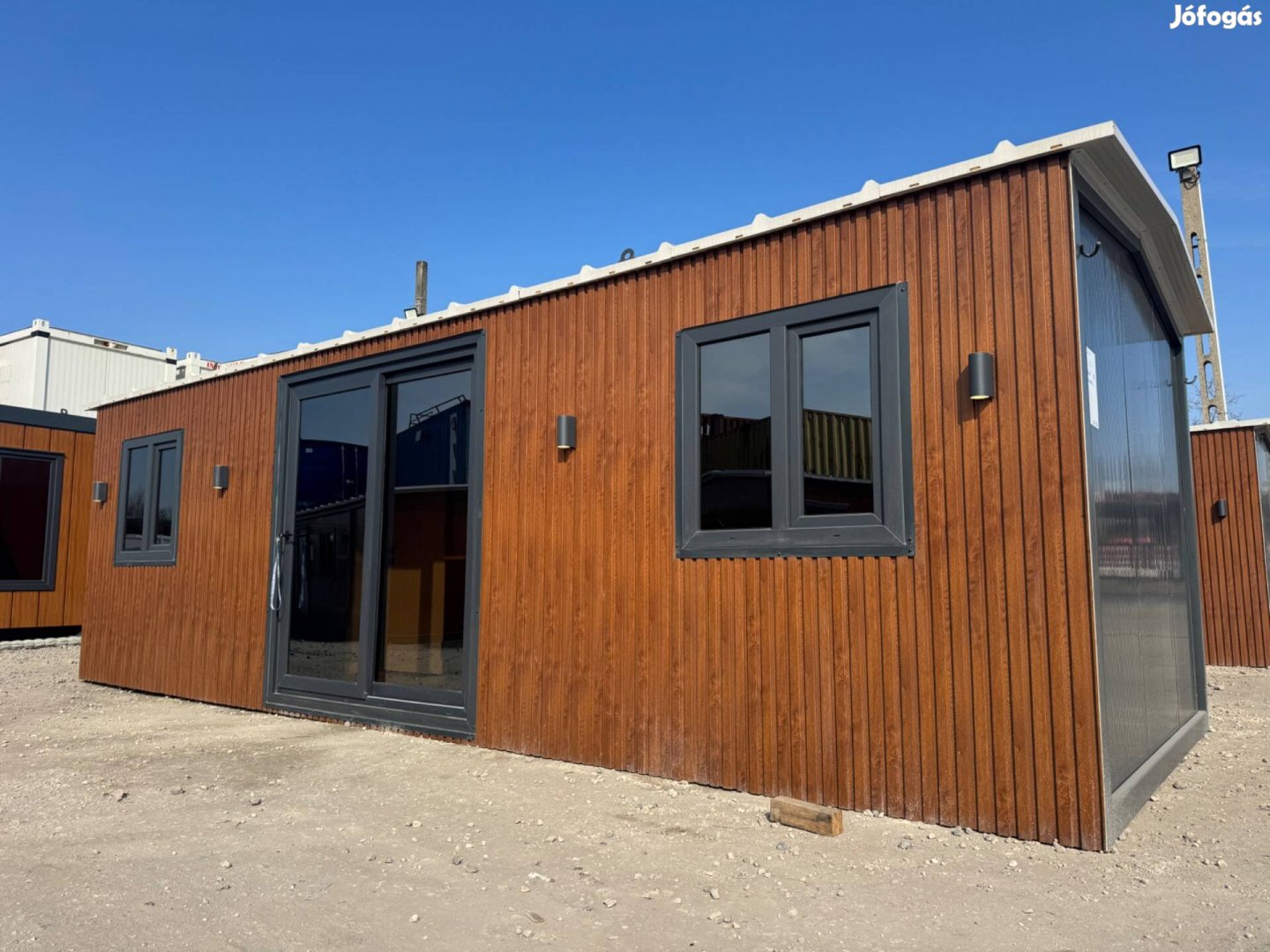 Eladó szabad készletről, azonnal szállítható tökéletes állapotban lévő, újszerű, berendezett mobilház 8m X 3m méretben, műanyag/100%-ban üvegezett oldalra nyíló bejárati ajtóval, 2db műanyag szigetelt ablakkal, 2db szobával, komplett konyhával, komplett fürdőszobával, ágyakkal, teljes berendezéssel! Antracit szendvicspanellel 3oldalon, valamint design front oldallal, homlokzattal, nyeregtetővel! Daruzható, könnyedén szállítható mobil házikó.