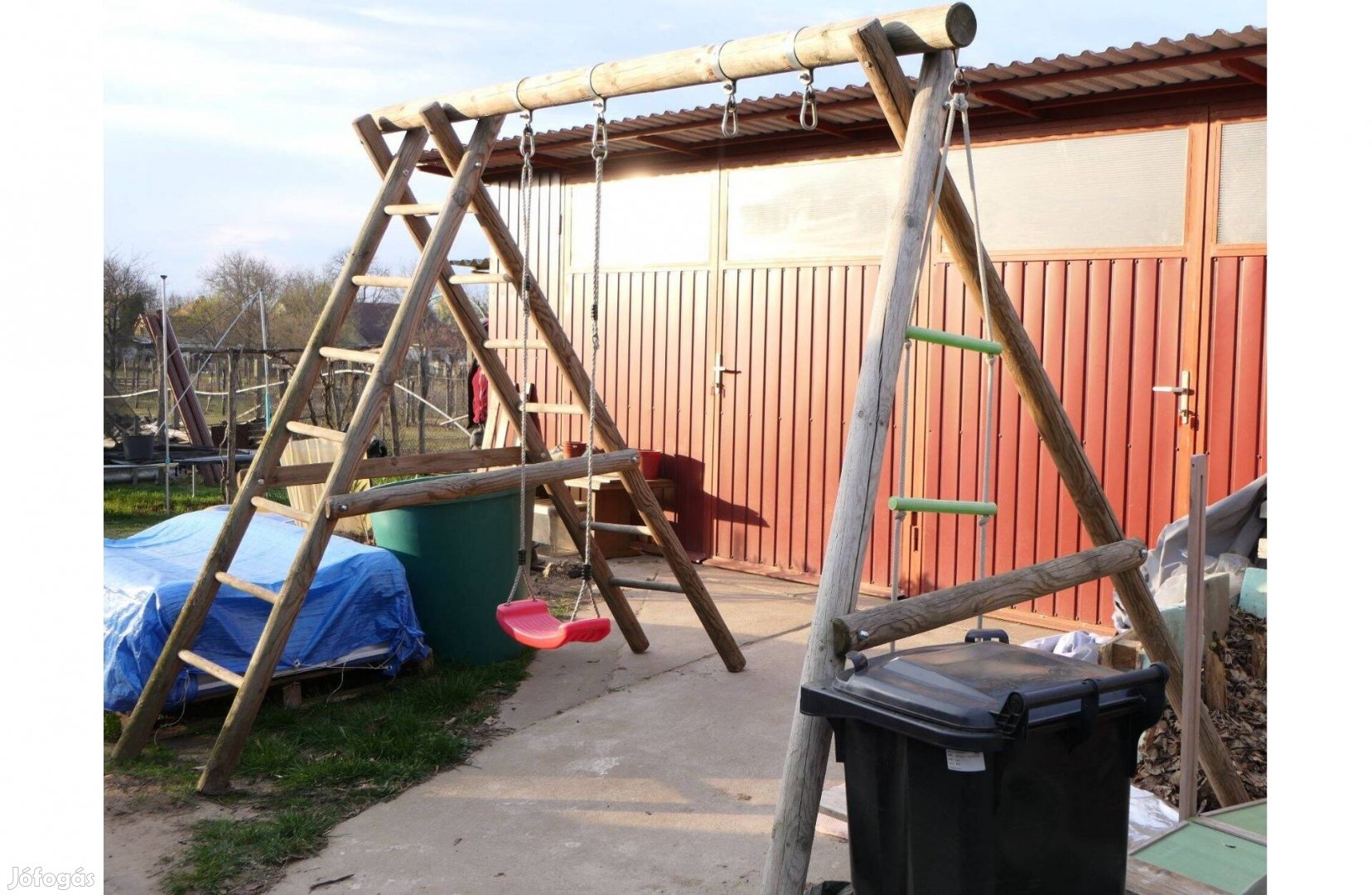 Masszív fa állvánnyal, két hinta lehetőséggel (egy hinta van meg, fészekhintával is használható, mivel van bőségesen hely), két létrával, mászókötéllel.