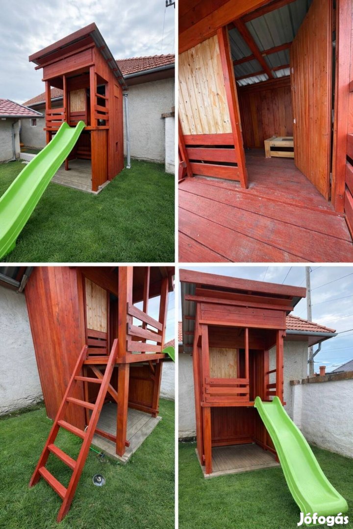 Eladó egy masszív, fából készült játszóvár zöld csúszdával.