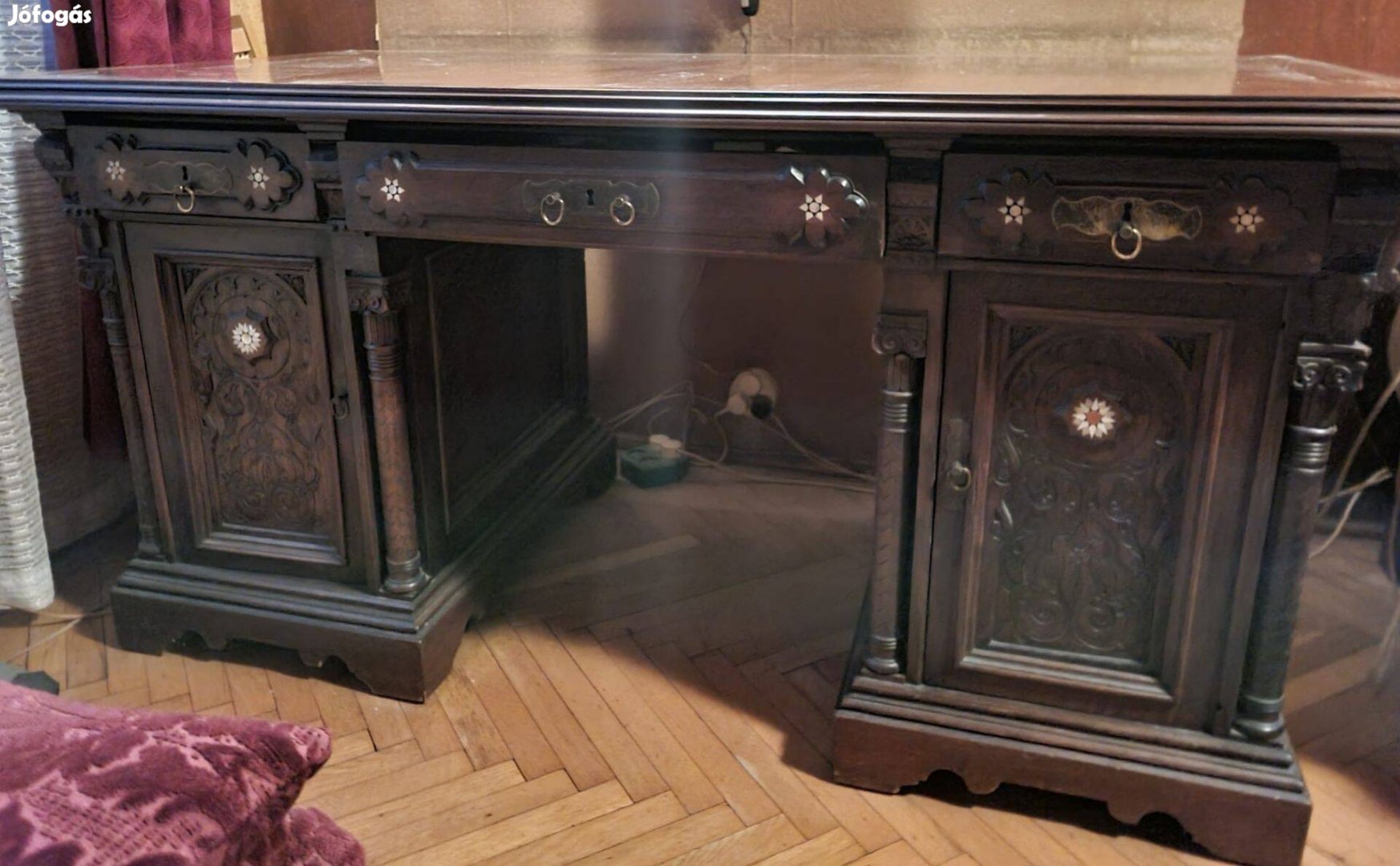 Eladó antik mívesen faragott neoreneszánsz íróasztal, oldalán egy kisebb hiányosság van, frontja és lapja igen megkímélt. Különleges szépségű, időtálló darab.
