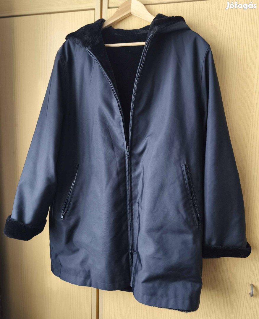 A Fekete, női , kapucnival is viselhető kabát. A külseje vizálló (orkánkabátszerű) szövet, a belseje fekete műszörme bélés. két oldalzseb is van. Zipzáras. hossz,85cm , mellbőség: 94cm. méret:kb.42