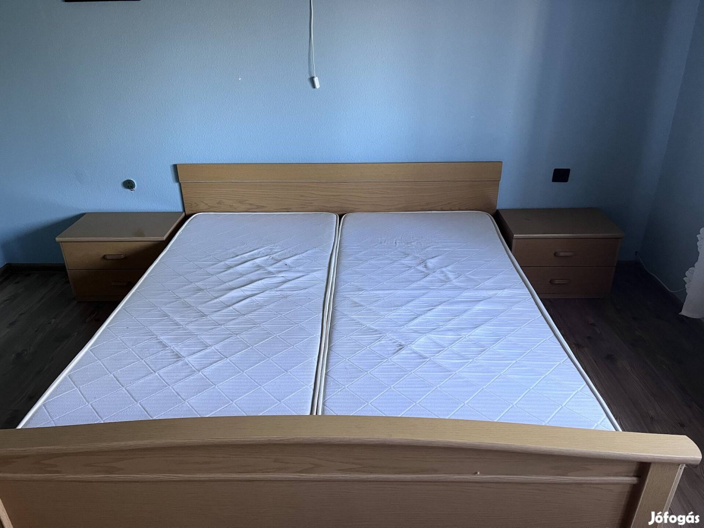 180x200cm franciaágy. Az ágyhoz tartozik egy felső keret is, ami jelenleg nincs felszerelve. Az éjjeliszekrényekkel a teljes szélessége 305cm. Matracokkal és minden tartozékkal együtt vihető!