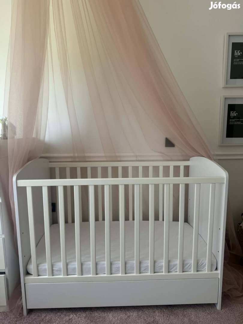 Párszor használt fehér,újszerű gyerekágy eladó!(a szülökkel akart aludni a kis huncut)A matrac merete :60x120,az ágyé:95x124x65.A fekvö Rács 3 féle magasságban állitható!Oldal rácsából két pálca kivehetö.Alul kihúzhato ágynemü tartó.Jelenleg szétszerelt állapotbanvan,igy konnyebb Szállitani.üdv.egy nagypapa