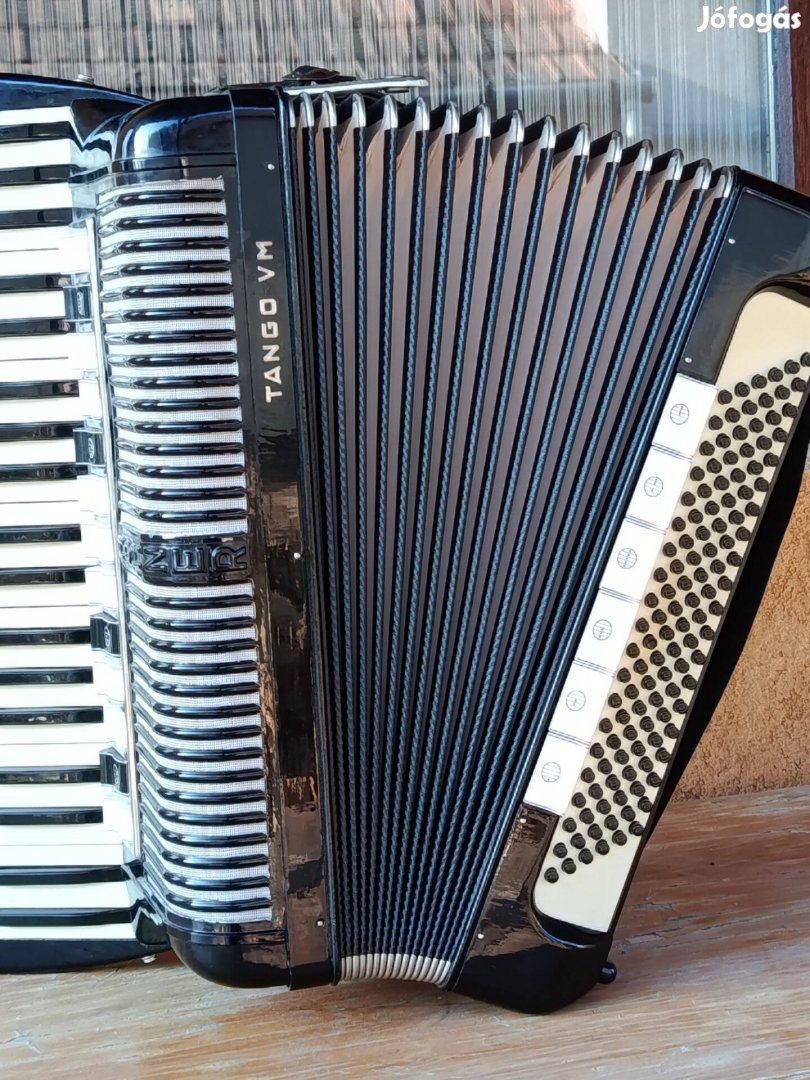 Eladó 120 basszusos Hohner Tangó V M harmónika.A hangszer új fújtatóval,új vállszíjjakkal és új basszus oldal szíjjal van szerelve. Néhány éve lett ventilezve. Súlya 9,5 kg.