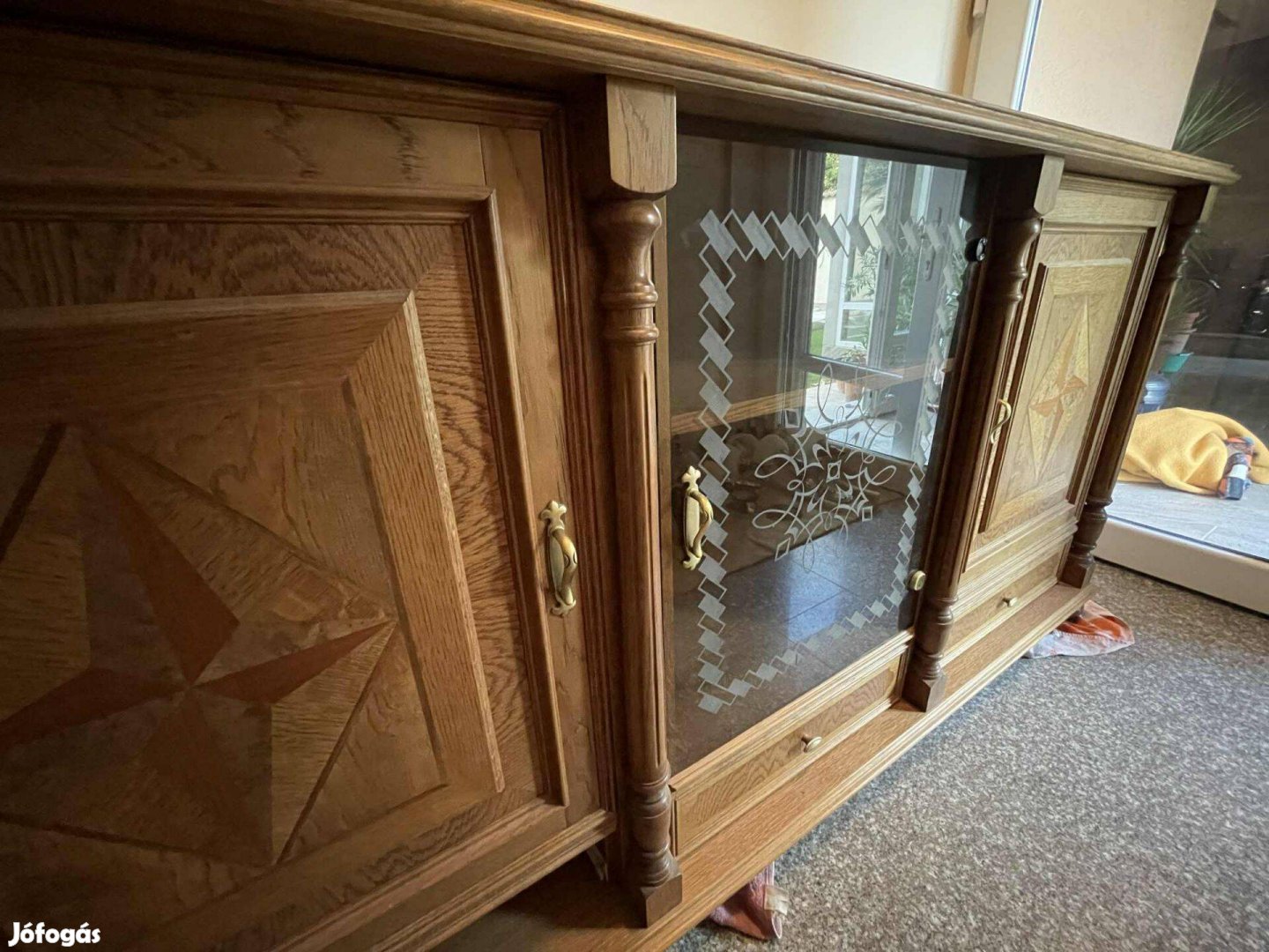 Eladó egy jó állapotban lévő tölgyfa intarziás komód. Méretei: szélesség: 210 cm Magasság 105 cm Mélység 70 cm.