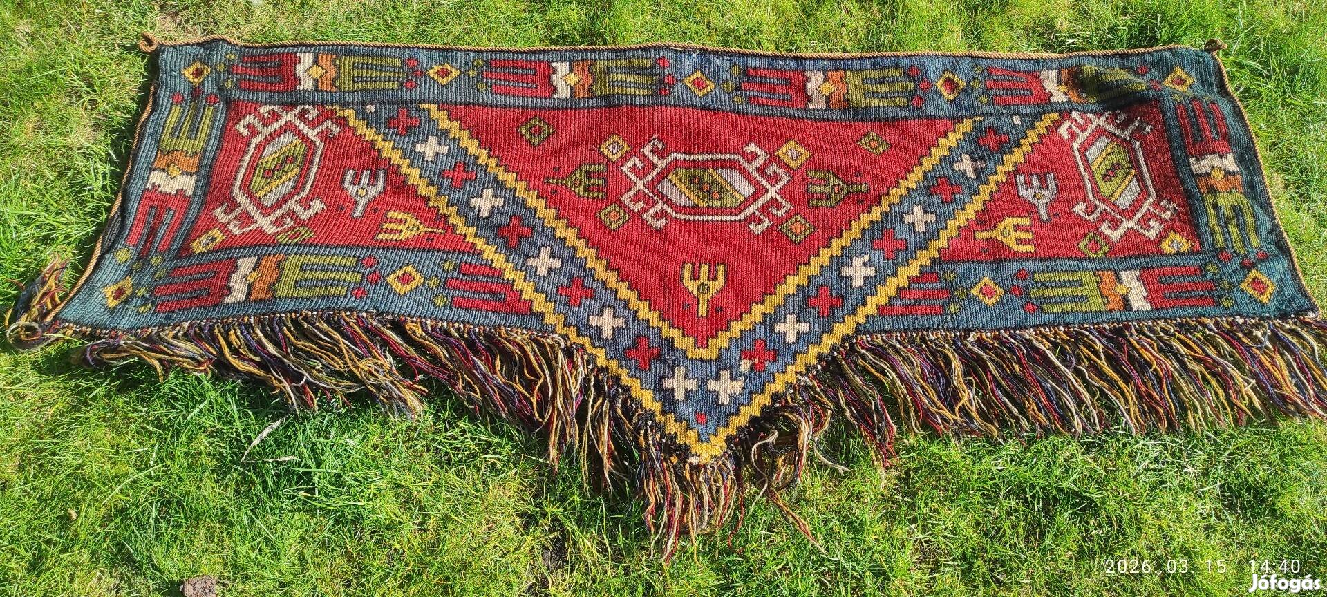 Régi egyedi kelim falvédő. Vannak rajta szem hibák, javításra szorul. A hátulján a fedőanyagot cserélni kell.