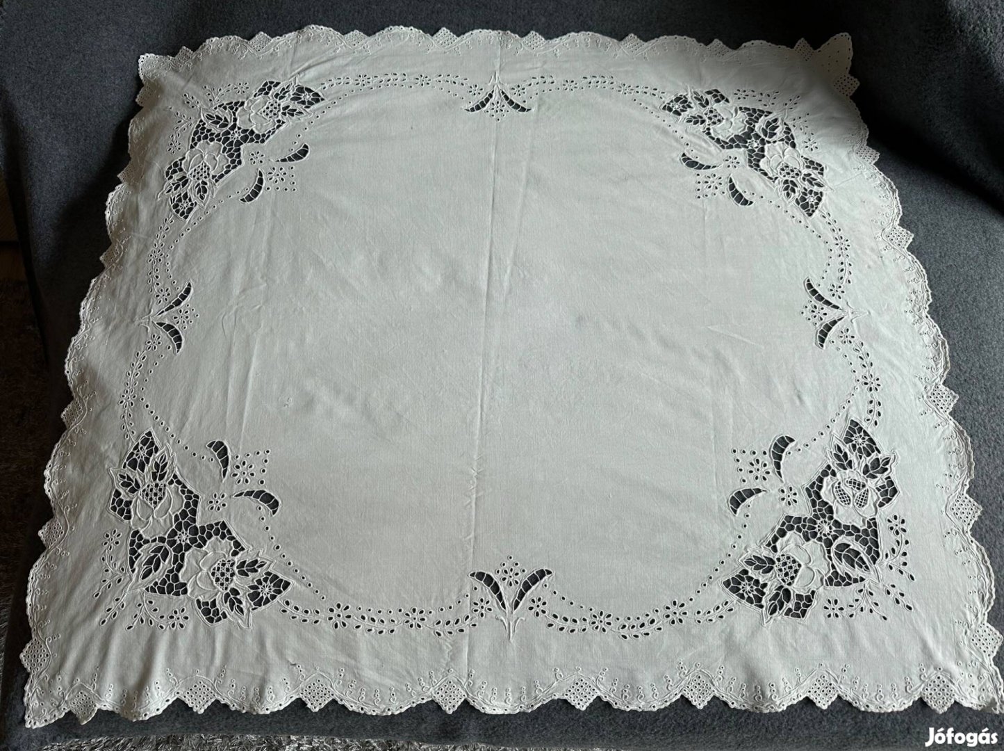 Eladó egy lyukhímzéses, nagyobb méretű terítő, gazdagon áttört virágmintával. A nagymamám készítette.