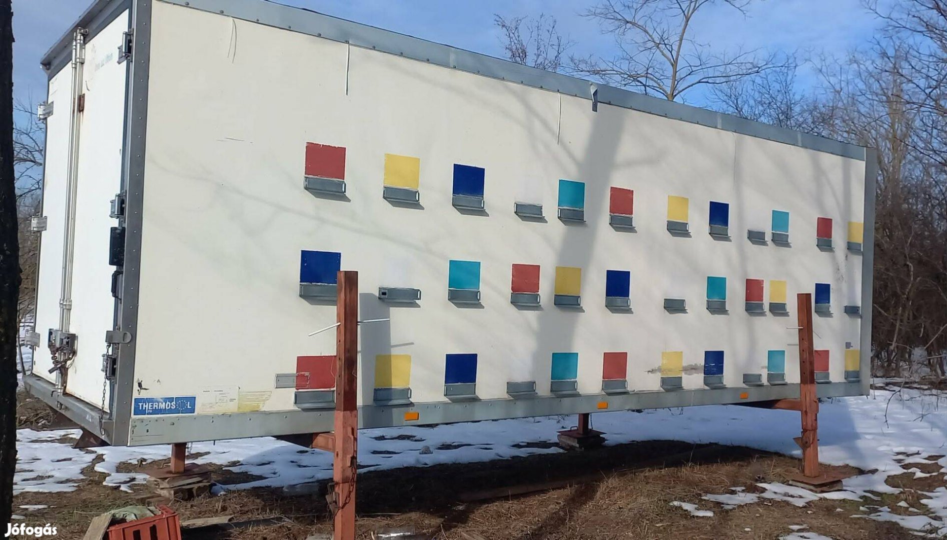 Méhészkonténer, 72 férőhelyes, nagyboconádi kaptárméret, 680cm hosszú x 260cm széles.