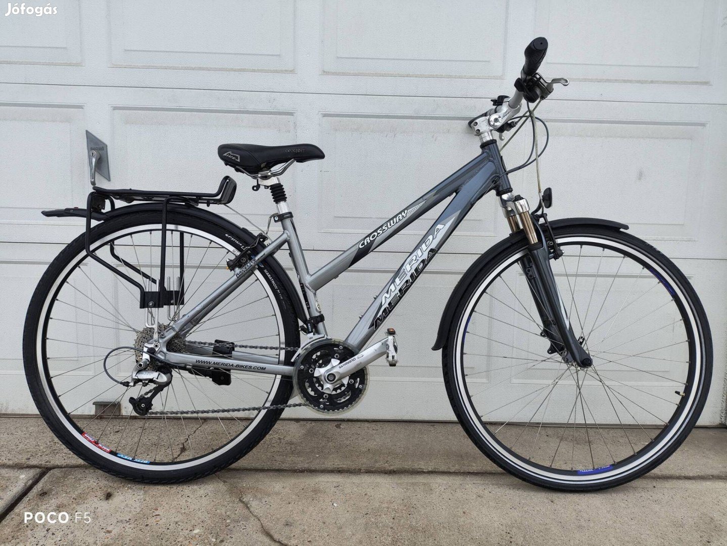 Eladó, a képeken látható prémium kategóriás "Merida-Crossway 8800" típusú, 28 colos könnyű aluvázas Cross-Trekking kerékpár. A kerékpár keveset volt használva, gyönyörű esztétikai és kiváló műszaki állapotban van! Teljes extrás változat, a következők szerint.: Minőségi, "Alloy-7005"-ös aluminium ötvözet váz, 46-os vázmérettel (155cm-től-175cm-es testmagasságig optimális méretű), szép gyöngyház metál festés, 27 sebességes "Shimano-Deore XT" hátsó váltó, "Shimano-Deore" első váltó, "Shimano-Deore" kormányváltó, "Shimano-Deore" kerékagyak, Shimano lánc és lánctányér, Shimano hajtókar, Shimano fogaskeréksor, "Shimano-Deore" V-fékek, Tehát teljes magas minőségű "Shimano-Deore" felszereltség! Valamint, állítható erősségű "SR-Suntour" teleszkóp, 60 fokban állítható dőlésszögű "Light-Mike" minőségi kormányszár, "Light-Mike" szélesített aluminium kormány, tenyértámaszos kormányfogantyúk, "Light-Mike" teleszkópos nyeregcső, "Light-Mike" minőségi gél üllés, aluminium csomagtartó, minőségi műanyag sárvédők, (az utóbbiak nem gyári tartozékok!), magas minőségű, olasz gyártmányú "Ritchey-Rock Comp" tripla falú erősített felnik! (háromszorosan erősítve!), "Schwable-Marathon Plus" defekt tűrős és fényvisszaverő csíkos gumik, csengő, prízmák, oldaltámasz, Stb.Stb. Személyesen Izsákon lehet megnézni, vagy házhoz szállítással is megvásárolható! Kérem nézze meg további hírdetéseimet is! Köszönöm!