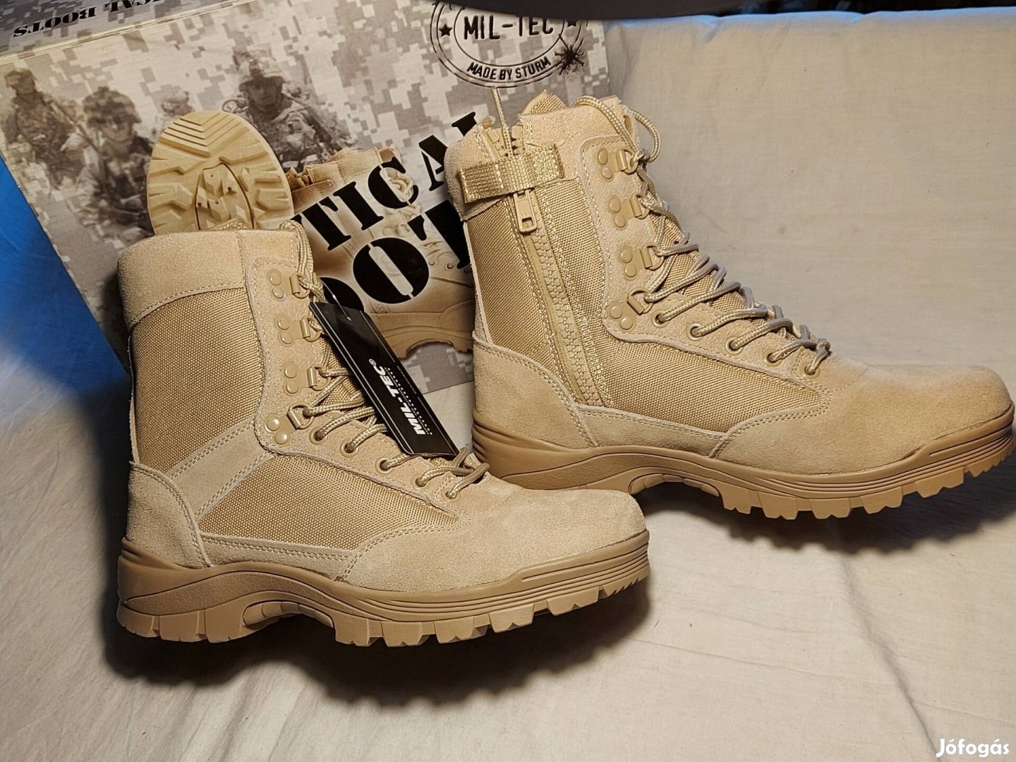 Mil-Tec taktikai bakancs, YKK zipzáros, fűzős, bőr és cordura, könnyű, kényelmes, vadonatúj, dobozában, méret : 44. Foxpost:1200ft.