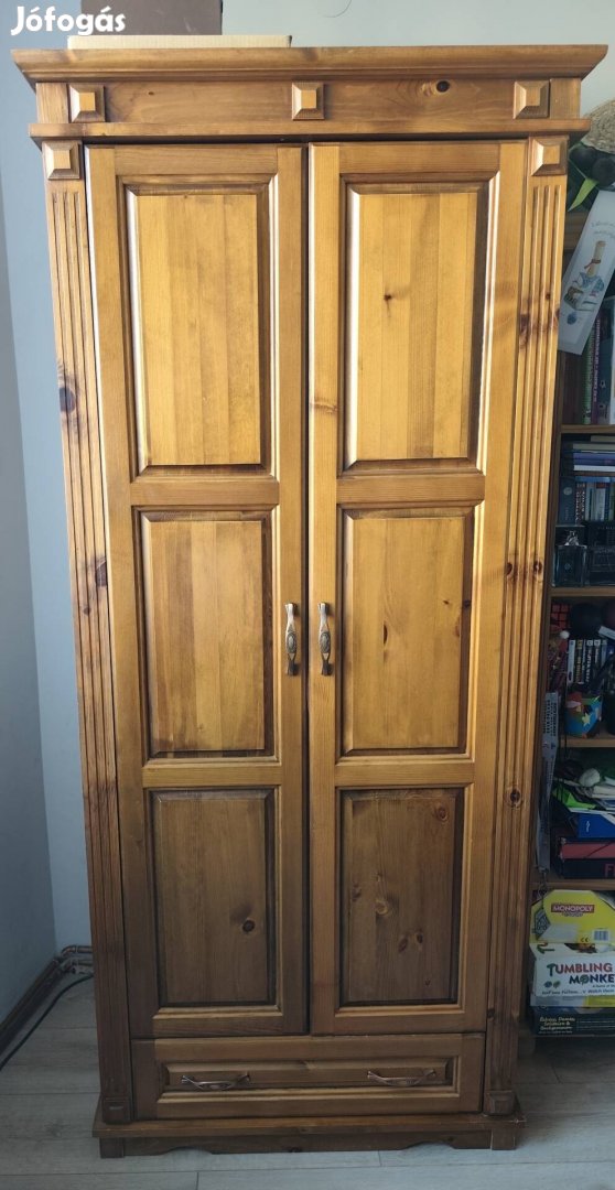 Möbelstar antik hatású, gyönyörű, míves kidolgozásaú borovi fenyőpácú bútor. A szekrény két ajtós egy fiókos, akasztós 98x192 cm.