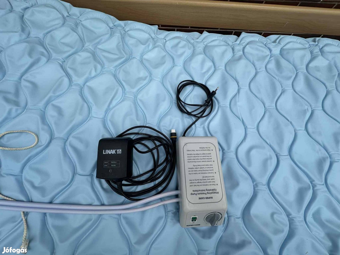 Több irányban állítható motoros ágy, levegős, felfekvésgátlós lepedővel, matraccal, és egy betegemelő újszerű akkukkal.