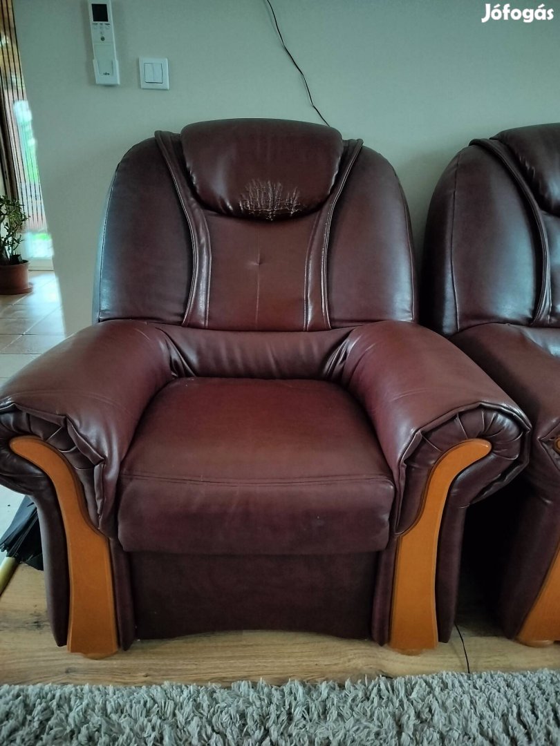 4 részes műbőr ülőgarnitúra. A 3 személyes kanapé ágyazható, a 2 személyes kanapé ágyneműtartós, a fotelnek van kihúzható lábtartója. A negyedik elem egy puff. Színe sötétbordó. Kecskemét-Katonatelepen található.