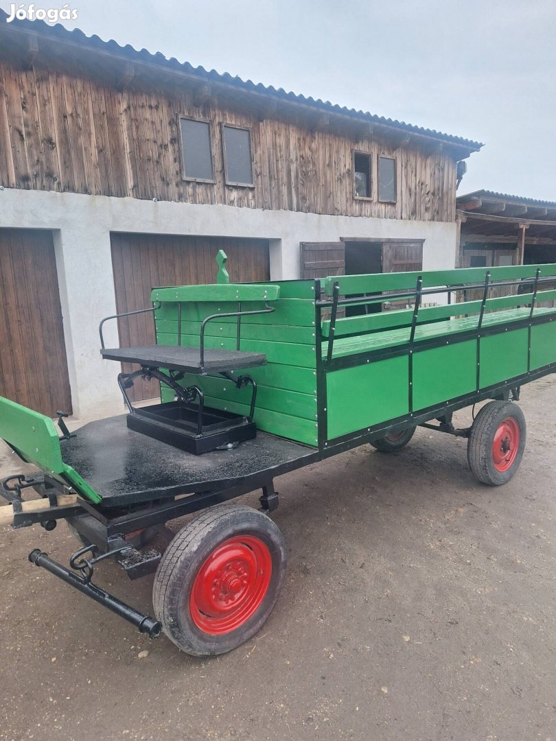 Eladó a képeken látható pados kocsi. lemez platós, lemez oldalak, két hatsókerék tárcssfékes. 3m hosszú padokkal, 12 fő kényelmesen elfér hátul. Tel: