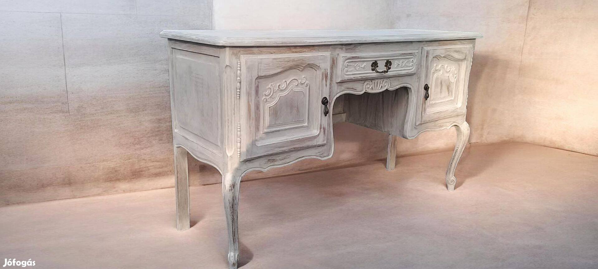 Eladásra kínálunk egy neobarokk provence stílusban felújított kis íróasztalt,fésülködő vagy tv alá helyezhető hosszú komódot.