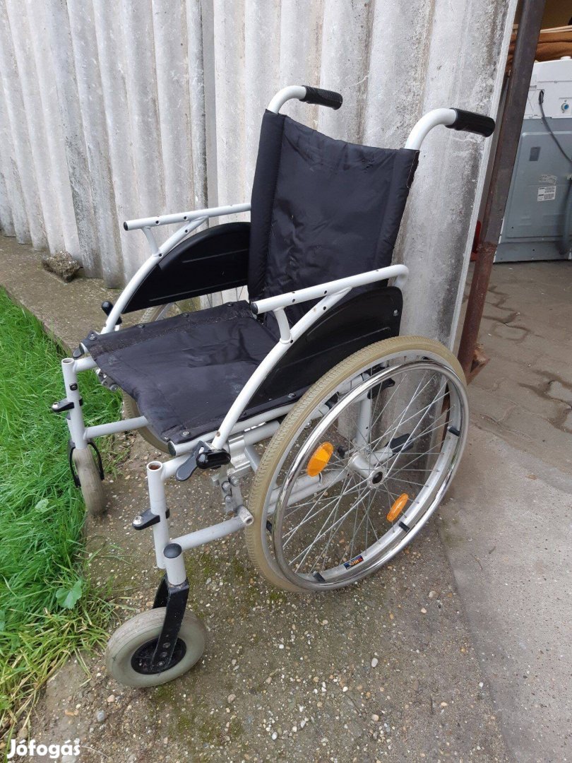 Összecsukható kerekes szék fékes megkímélt a képeken látható állapotban eladó. Tömör gumikkal a lábtartó hiányzik.