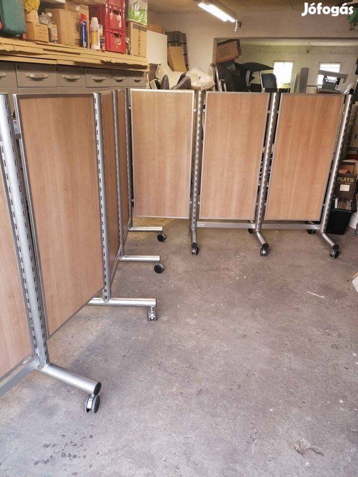 Komoly gyári alumínium szerkezet, bútorlap betétekkel. Könnyen szétszedhető és összerakható. Ívben, vagy derékszögben is szerelhető. 7 db dupla elem van. Egy elem 3 függőleges oszlopból áll alul összekötve. Minden oszlop 2db fixálható keréken áll. Egy dupla elem mérete: hosszúság 128cm, magasság 135cm. Az elemeket az oszlopok között 55 centis bútorlap betétek kötik össze. A hét dupla elem az összekötőkkel összesen 12.2 méter hosszra állítható össze. A kerekek fékezhetőek. Tárolása helytakarékos, szorosan egymás mellé tolhatóak így kb 2mx1,5 méter alapterületen elfér. (képek között látható) A kiírt ár egyben az összes elemre vonatkozik. Szállításban tudok segíteni.