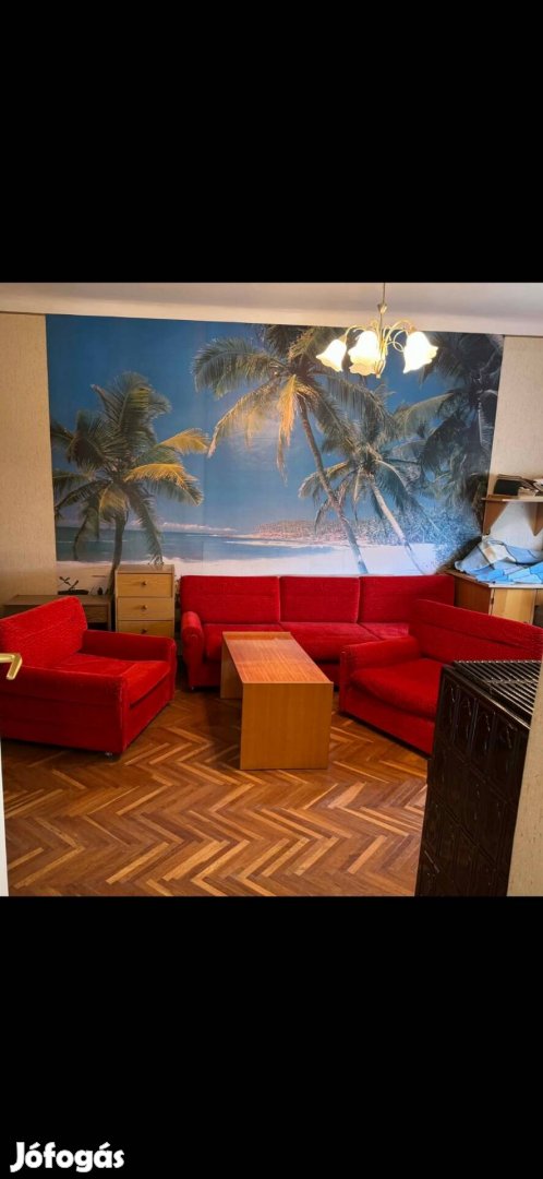 Eladó a képen látható, élénkpiros retro ülőgarnitúra (kanapé és két fotel). Kifejezetten ajánlom retro stílus kedvelőinek, vendégházakba vagy nyaralókba.