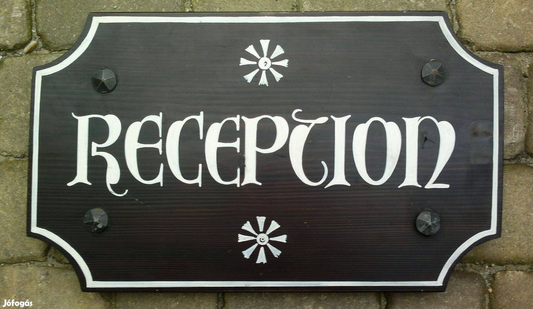 Eladó egy Reception feliratú, kézzel festett fatábla. Méretei 49,5 cm x 29,5 cm. A tábla vastagsága 2,4 cm.