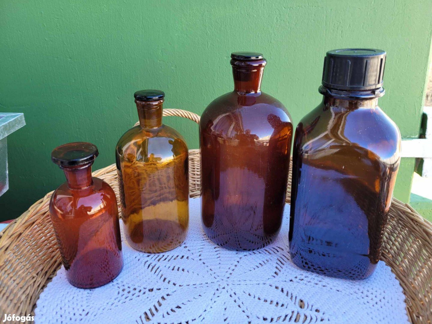 Eladásra kínálom a képen szereplő régi borostyánsárga gyógyszeres üvegeket. A képek magukért beszélnek. Körbe fotóztam. Szép állapotban. Megadott ár a 4 db-ra értendő. Az első és utolsó teteje eredeti, a harmadik is, utolsó képen, az üveg száján és a dugó belsején is lepattanások. Mivel ez a dugó meglett, van egy plusz kicsi eladó. Itt nem képezi az aukció tárgyát.
