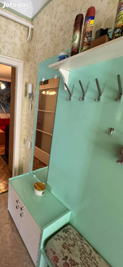 Eladó a képen látható retro előszobabútor. Megkímélt állapotú, kisebb esztétikai hibákkal. Eredeti retro akasztókkal rendelkezik. Figyelem: a tükör régi, cserére szorul. A bútor egyben van, nem szétszedhető.
