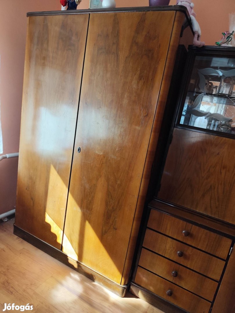 Új helyen ékeskedne ez a megkímélt állapotú retró vitrines szekrénysor. Ez még fából van. Szép ékessége lenne egy tanyasi szobának. Érdeklődni telefonszámon lehet