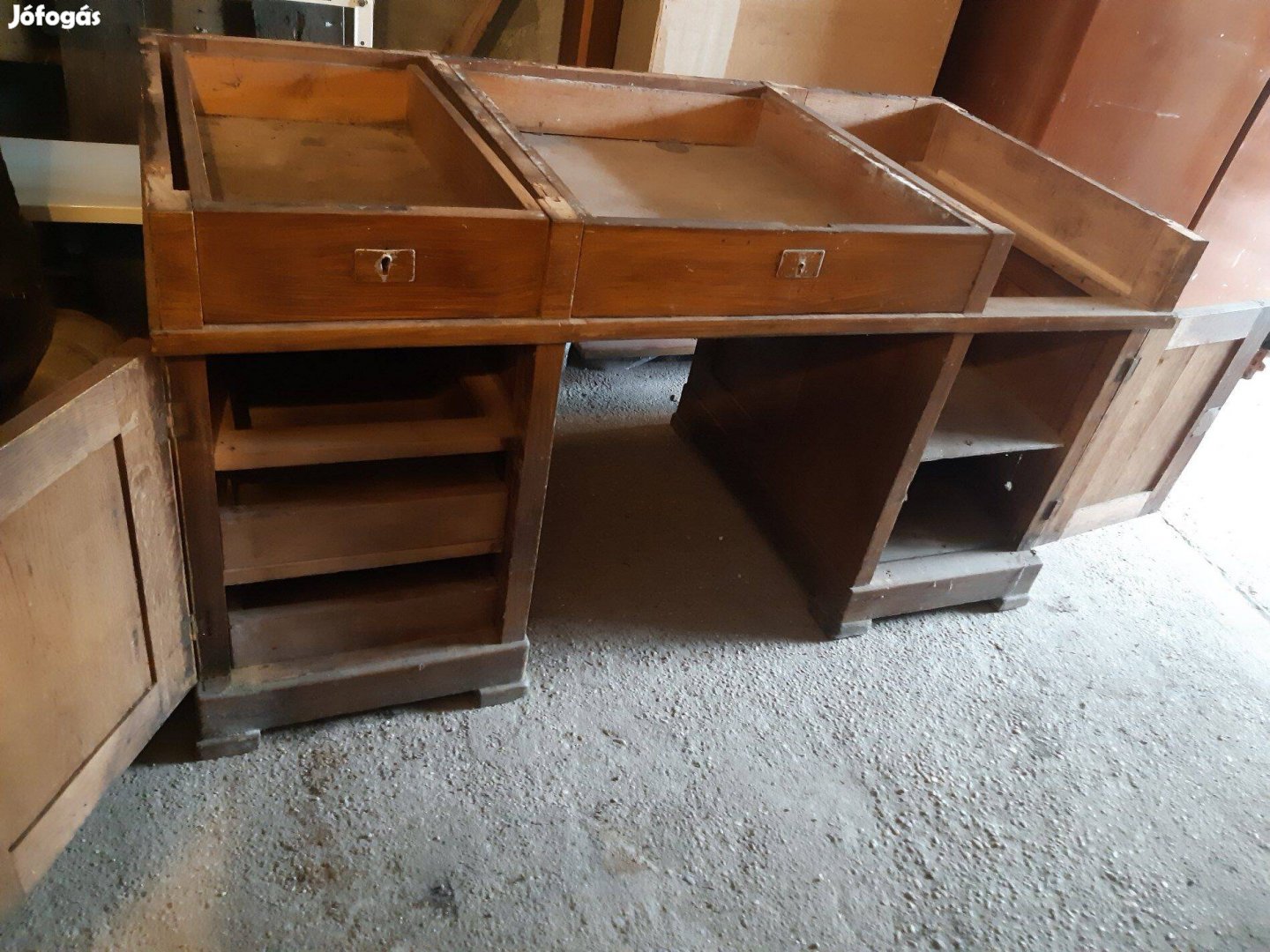 Robosztus régi fa íróasztal 70x150cm hosszú hiányos a képeken látható állapotban eladó. Szerkezetileg stabil, 2 emberes darab. A teteje, a jobb szélső front fiók és 1db belső fiók hiányzik!
