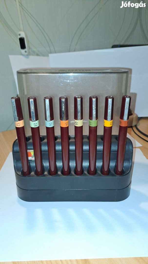 Eladó egy megkímélt állapotú, eredeti Rotring 2000 csőtoll készlet, 8 darab különböző vonalvastagságú tollal. A készlet tartalmazza a gyári víztartályos állványt ( rotring rapidomat), amely megakadályozza a tollak beszáradását használat közben.