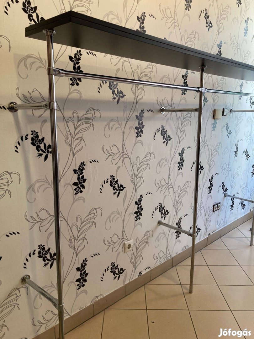 Eladó krómozott ruhatartó állvány falhoz rögzíthető,fekete fa polccal.