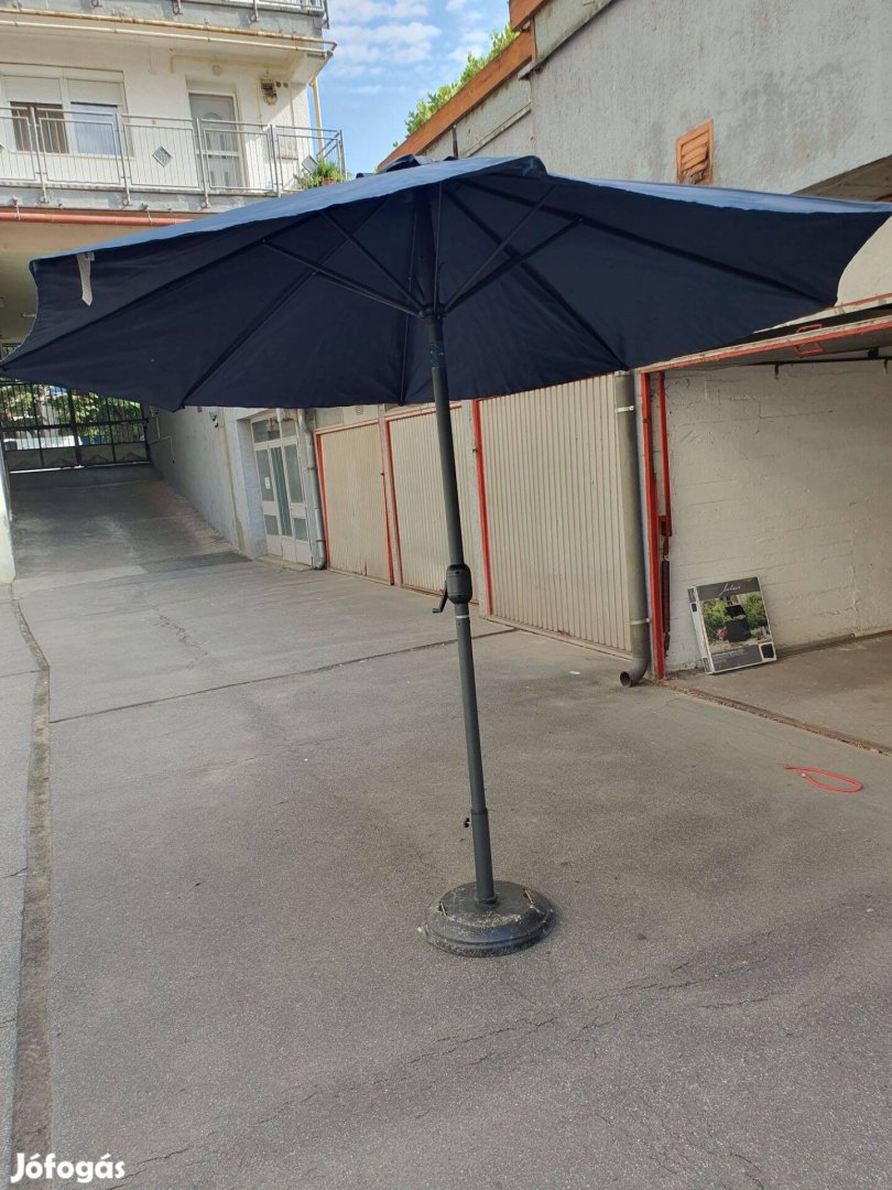 Fekete vászon. Ernyő átm: 240 cm csigás felhúzóval , az ernyő korlátozottan ellenáll az enyhe esőnek és harmatnak