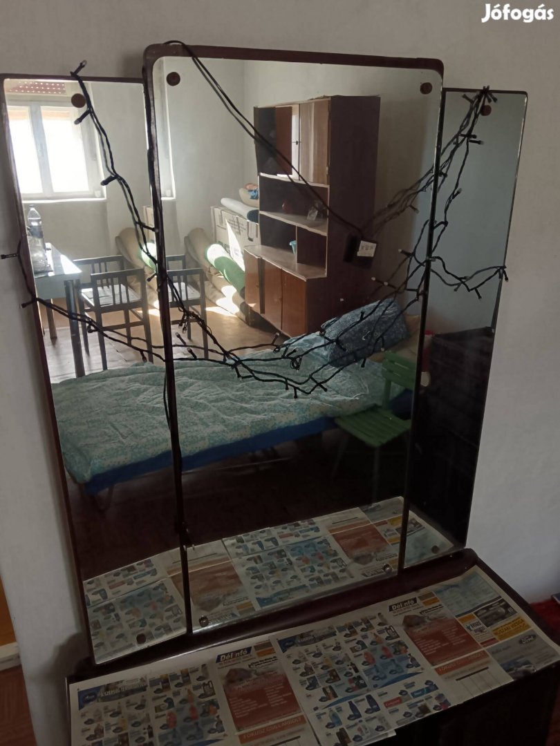 Antik tükör szekrény tükör mindkét oldalán becsukható. középen üveges résszel, két szélén szekrény