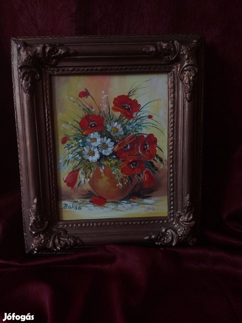 Szignózott virágcsendélet! Mérete: 31x36 cm! Olaj, farostra festve blondel keretben! Ára: 8500 Ft+posta! Utalás után postázom!