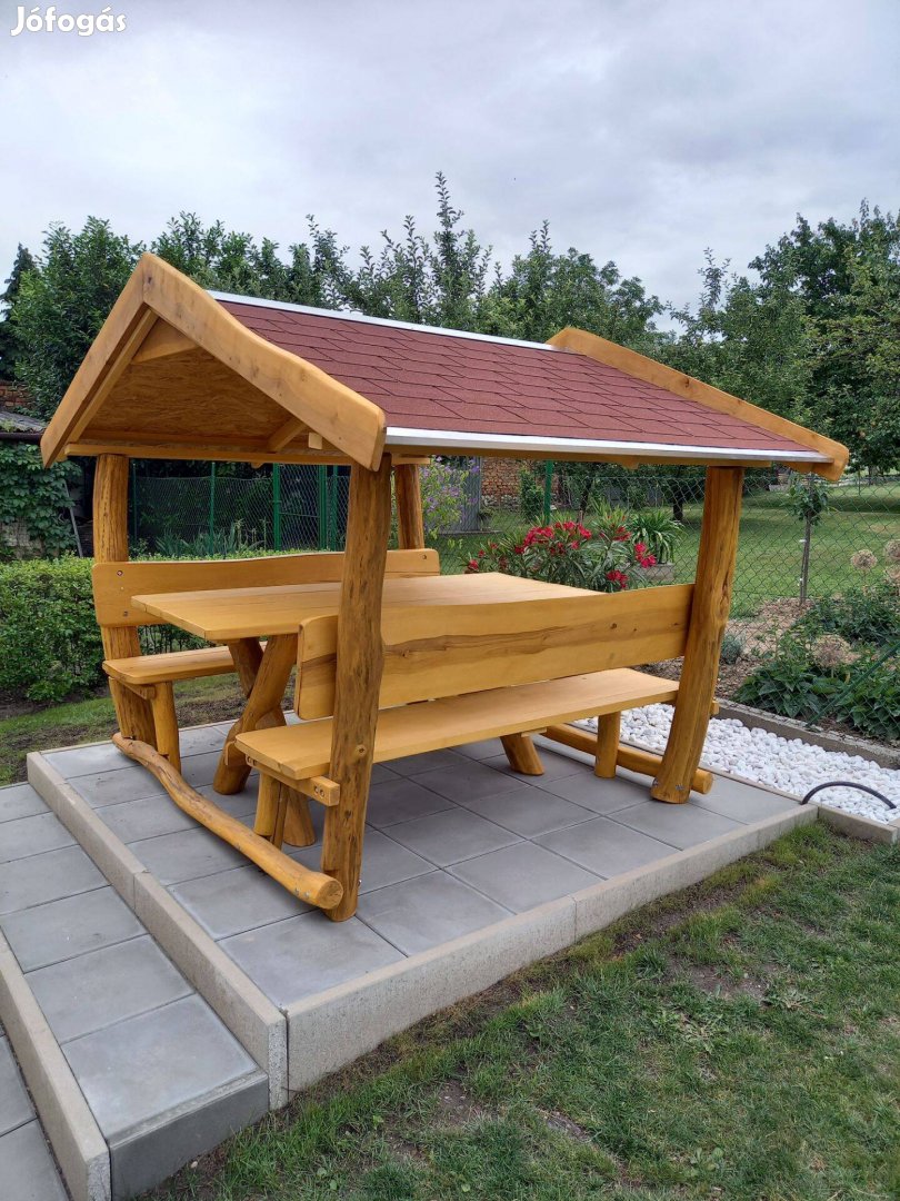 A tető és a padok egybeépítve, az asztal külön mozgatható.