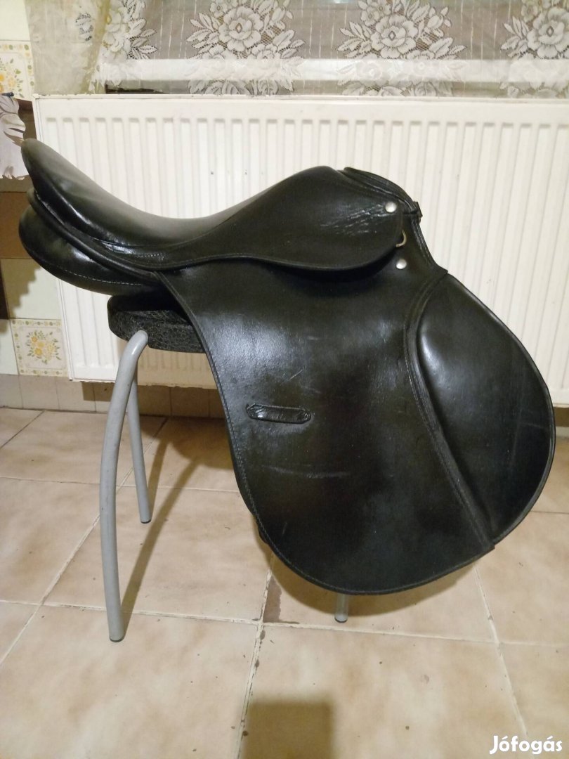 A képeken látható használt, de korához képest kiváló állapotú valódi bőr, favázas, szinte elnyűhetetlen, tömhető, lóra igazítható univerzális angol nyereg eladó. Hátraszabott markamra által magas marra is jó, keskeny, sportos lóra való. Felrántószíjak erősek, hasított, vastag bőrből, szinte újak. Térdtámaszok, ülőfelület közepesen puha, kényelmes, a nyeregpárnák jól illeszkednek a háton. Felületi kopáson, ráncon kívül mindene ép. Méreteit fotóztam, gerinccsatorna hátrafelé szűkülő, végén 2 ujjnyi. Ár: 50 ezer Ft. Baranya megye, Babarcon megtekinthető.