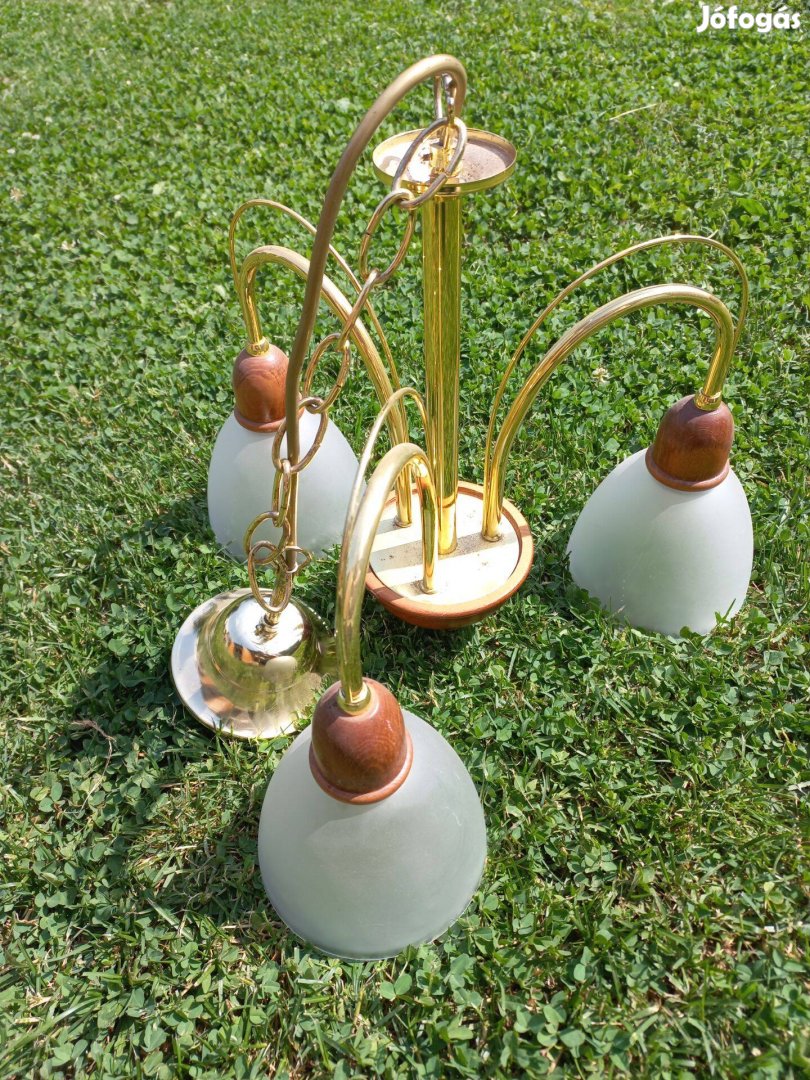 3 ágú, igényes kialakítású csillár. + vezetékes kivitel, tehát védőföldeléssel ellátott. Beépített akasztóval. Foglalatonként max. 40W terhelhetőséggel. Fém, fa és üveg kivitel a képnek megfelelően.