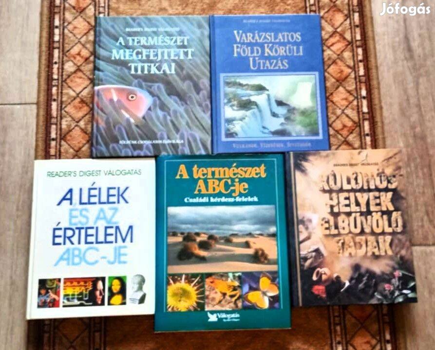 5 db nagyon szép, nagy méretű, vastag Reader's Digest válogatás könyv: Különös helyek, elbűvölő tájak + A természet megfejtett titkai + Varázslatos Föld körüli utazás + A természet ABC-je + A lélek és az értelem ABC-je. Az ár az 5 kötetre együtt értendő.